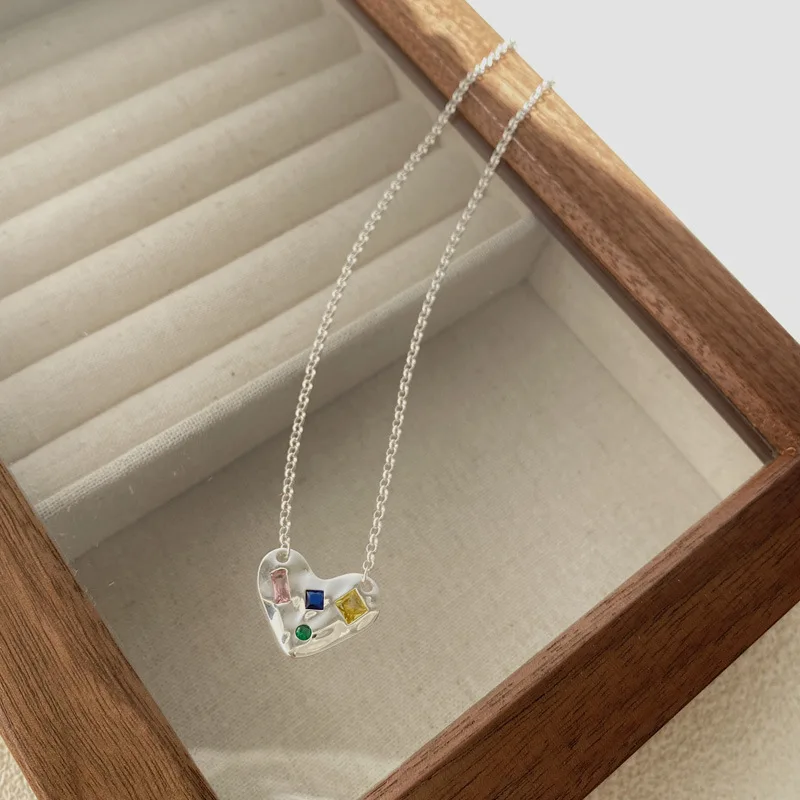 925 Sterling Silver Colorful Zircons Heart Shaped Pendant Necklace For Women Korean Chic Chokers Necklaces 2023 Winter New Gift