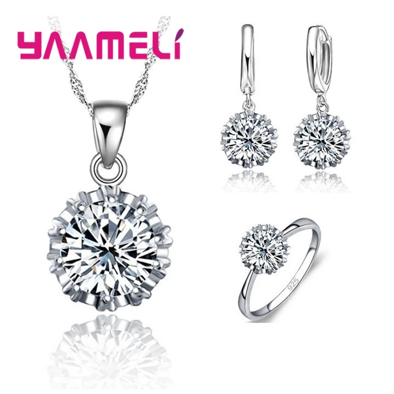 Classic 925 Sterling Silver Wedding Jewelry Sets For Women Big Stone CZ Cubic Zirconia Necklace/ Earring/ Ring Set Size 5-10