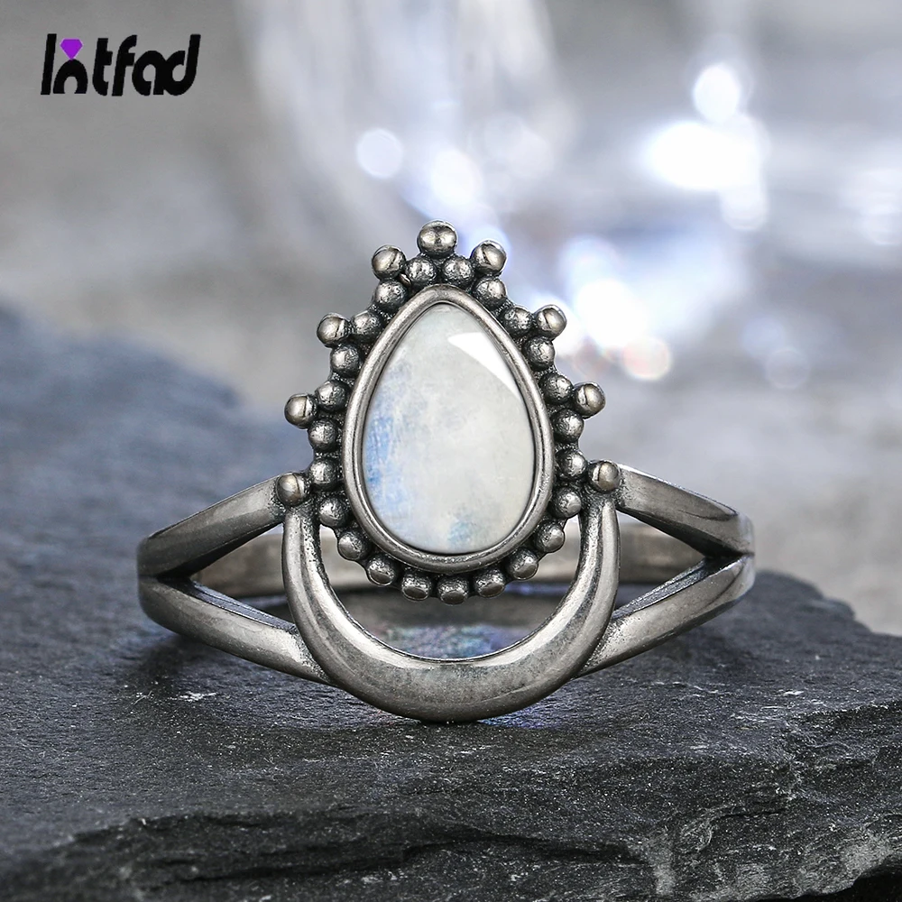 Natural 6x9MM Water Drop Moonstone 925 Silver Vintage Jewelry Wedding Party Gifts Finger Rings for Men Women