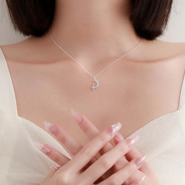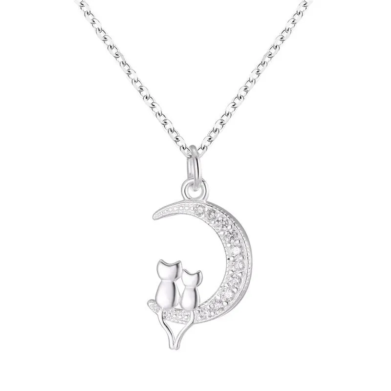 NEW European AAA CZ Moon Cat Wishes 100% S925 Sterling Silver Necklace Chain For Women Birthday Party Gift Jewelry