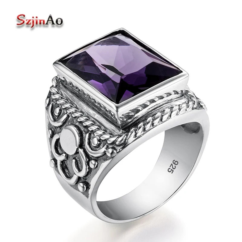 Real 925 Sterling Silver Heavy Signet Rings Men’s Massive Amethyst 12*16mm Stone Party Male Vintage Jewelry Gift For Husband Top