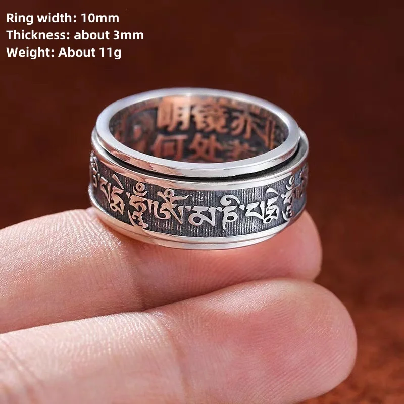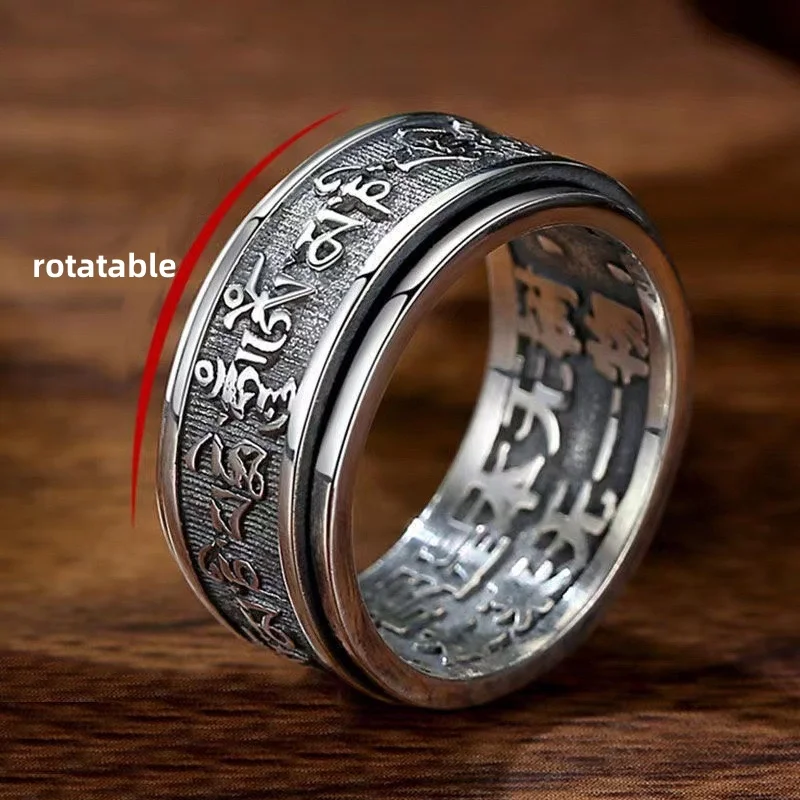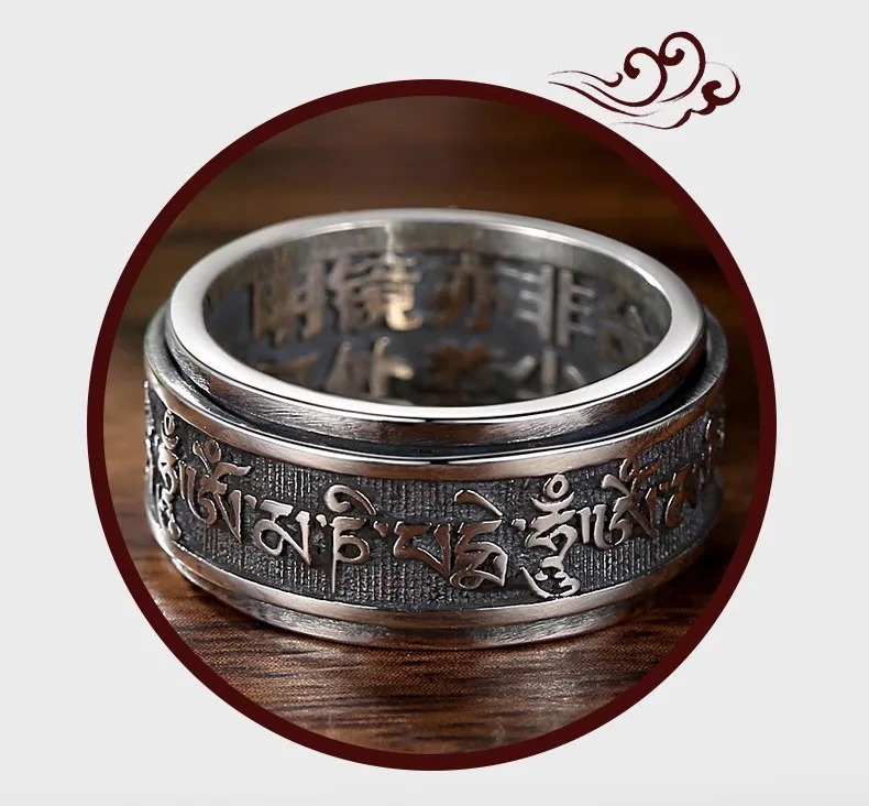 Real 925 Sterling Silver Vintage Rings For Men Rotatable Tibetan Six Words Mantra Rings Om Mani Padme Hum Buddhist Jewelry