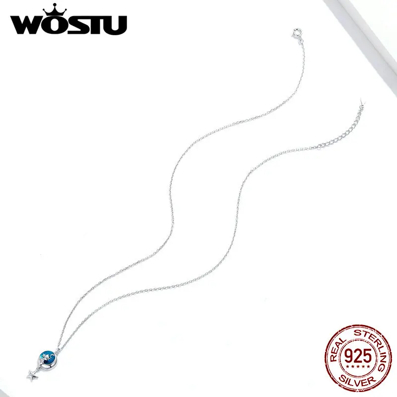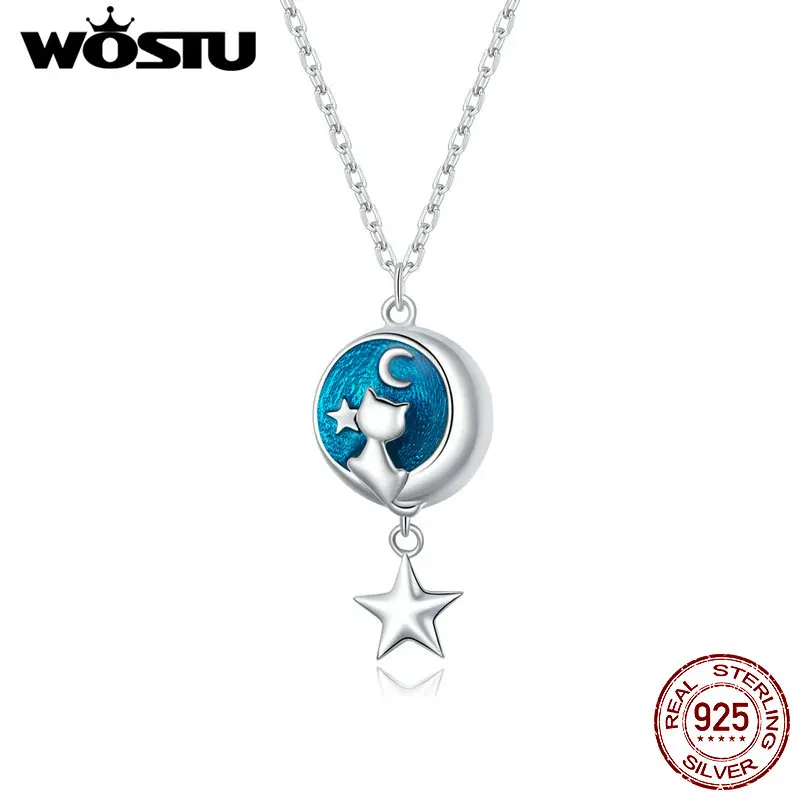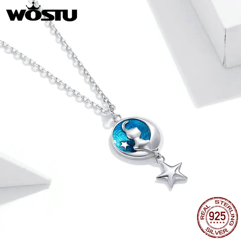 WOSTU 925 Sterling Silver Moon & Cat Star Necklace Blue Enamel Long Chain Link Necklace For Women Fashion Jewelry CQN422